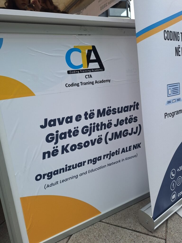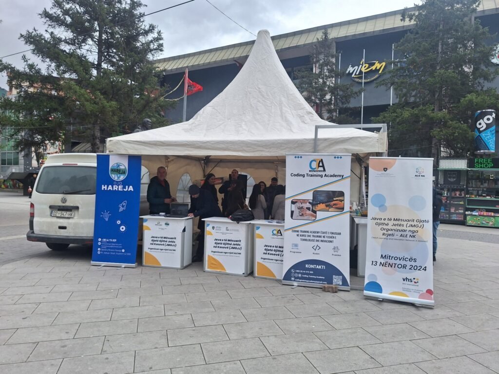 Prezentuam programet e Coding Training Academy në aktivitetin e mbajtur në sheshin e Mitrovicës, në kuadër të Javës së të Mësuarit Gjatë Gjithë Jetës, të organizuar nga DVV International dhe Rrjeti ALE NK, me mbështetjen e Qendrës Rinore Hareja Vushtrri.