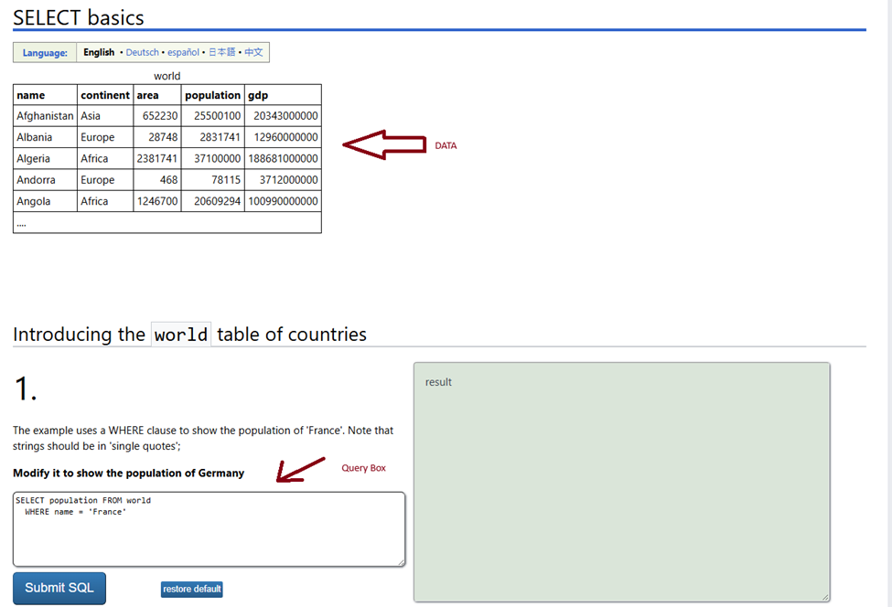 “Play with it, go like: SELECT population FROM world WHERE name = ‘Albania’;