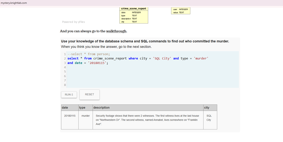 • Explore the schema (tables like person, drivers_license, interview, crime_scene_report, etc.)