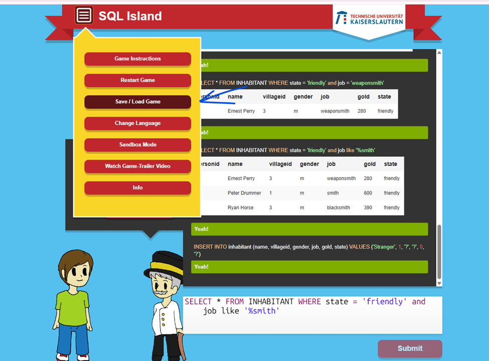 One of the best features of SQL Island is that you can save your progress and continue later.