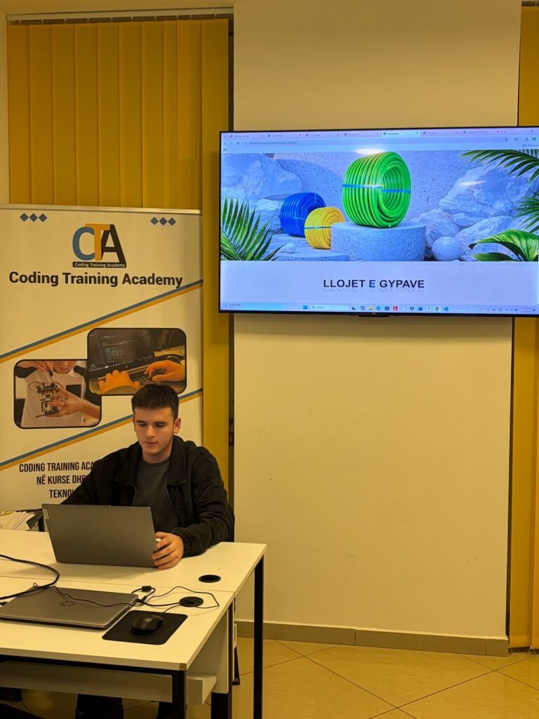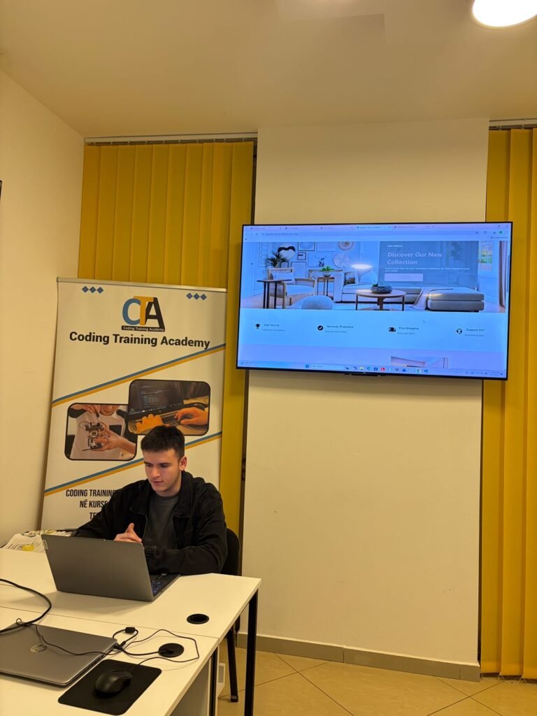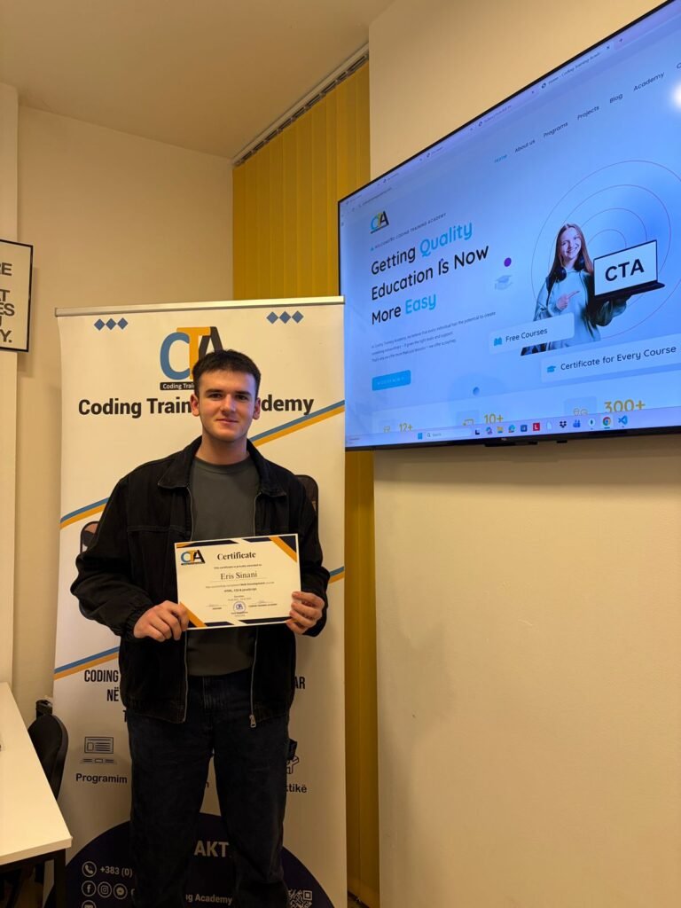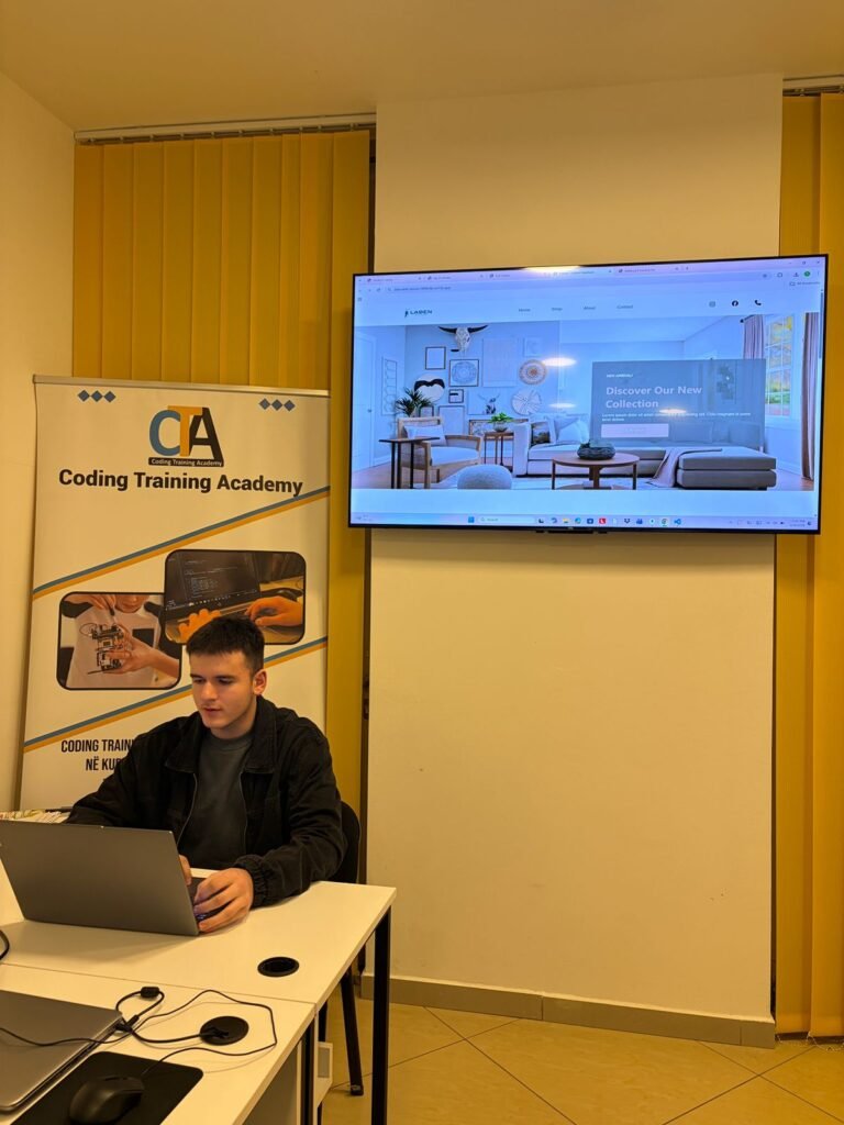 Eris Sinani ka përfunduar kursin HTML, CSS dhe JavaScript në Coding Training Academy. Gjatë trajnimit, ka krijuar web faqen e tij personale dhe ka prezantuar projektet e realizuara deri më tani, duke përfshirë një web faqe për riciklimin dhe prodhimin e plastikës si dhe një shop online për mobilje. Projektet pasqyrojnë aftësitë e fituara në ndërtimin e faqeve web, dizajnin modern dhe organizimin funksional të përmbajtjes.